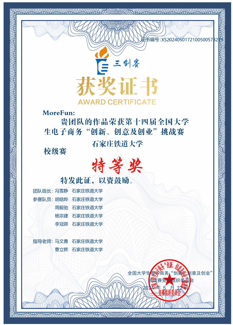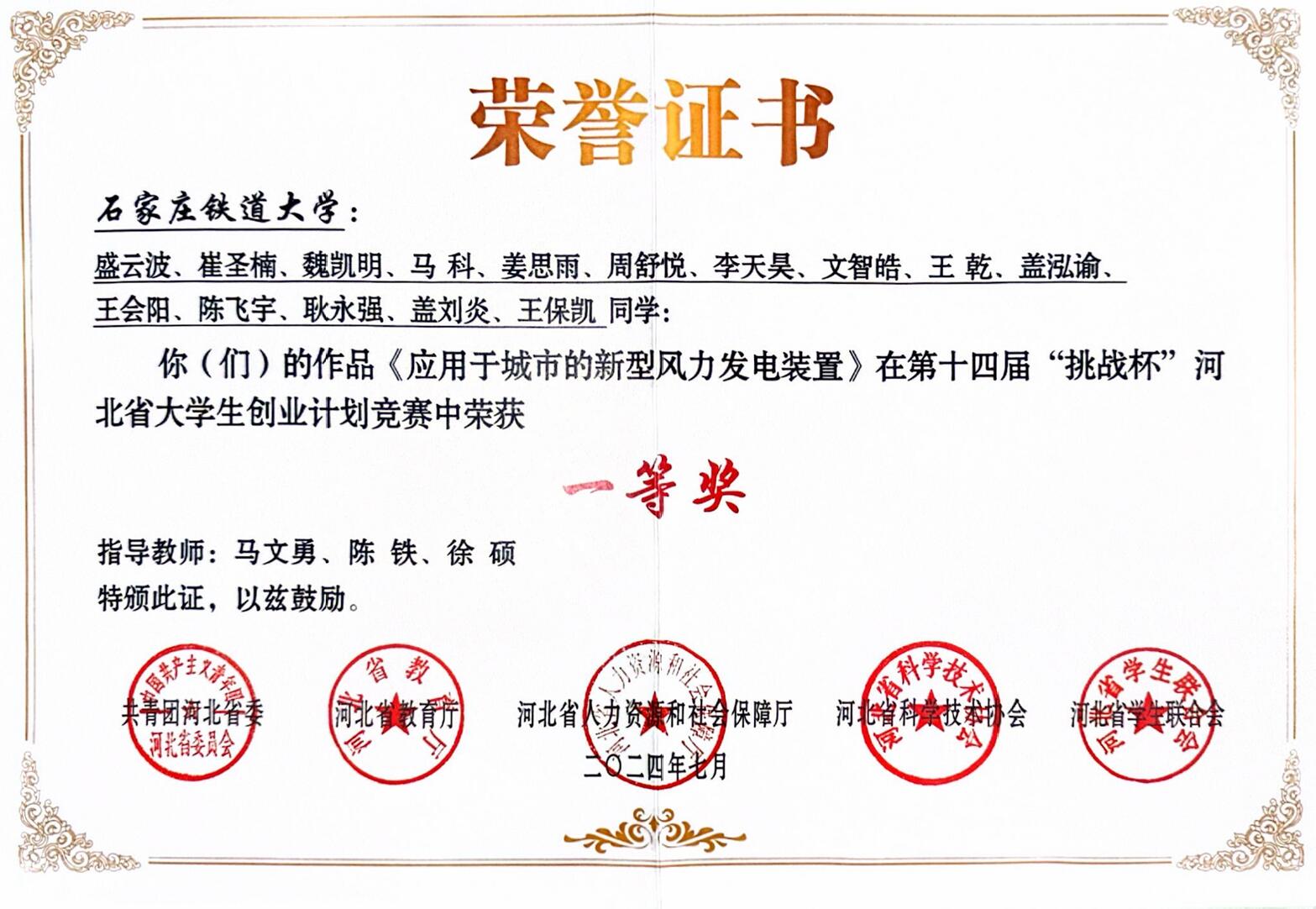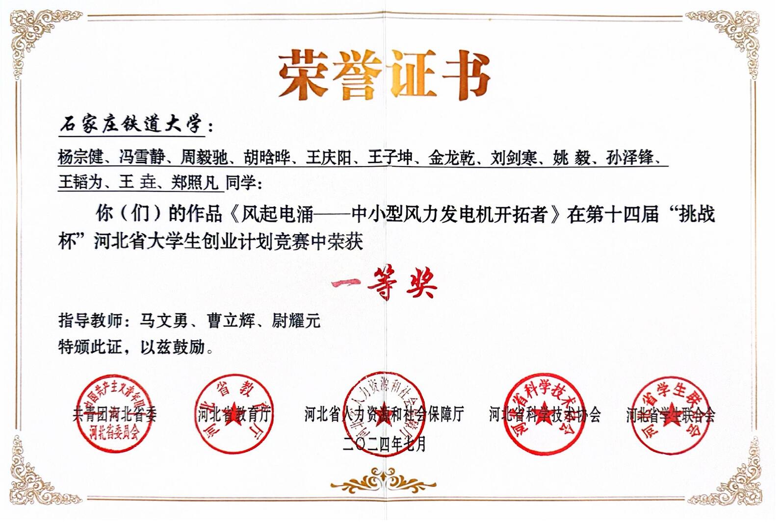 一等奖 2024年第十四届“挑战杯”河北省大学生创业计划竞赛