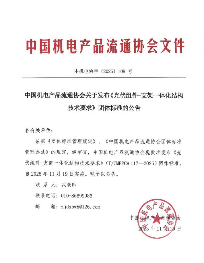 由中国机电产品流通协会组织编制的团体标准 《光伏组件-支架一体化结构技术要求》(T/CMEPCA 117—2025) 已正式发布并实施(链接)。课题组马文勇教授、张晓斌博士作为主要撰写人参与了该标准的编写工作,在光伏组件–支架一体化结构的材料选用、结构设计、防腐与耐久性要求及检测检验等方面进行了系统梳理与规范,对固定式光伏系统的工程设计与质量控制具有重要的指导意义。该标准的发布标志着课题组在光伏结构与工程应用方向的研究成果进一步获得行业认可,也为后续相关工程实践与技术推广提供了有力的标准支撑。